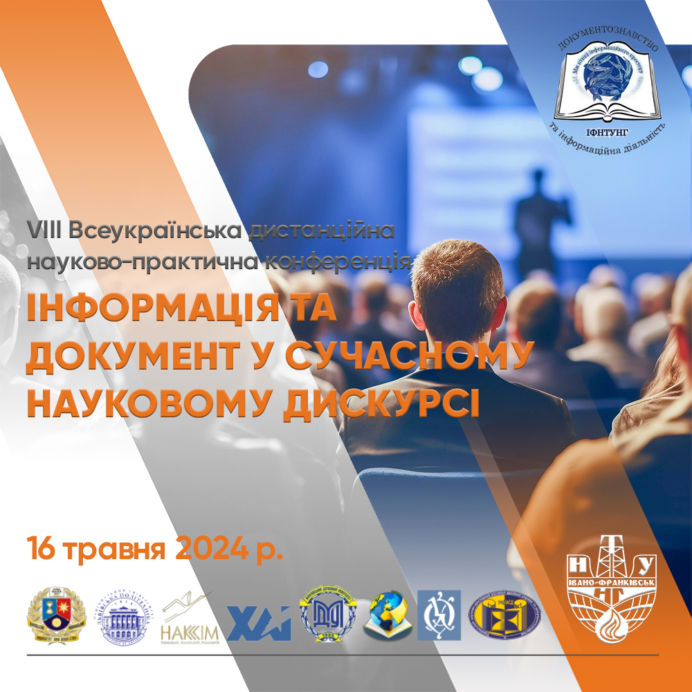 Організаційний комітет запрошує Вас взяти участь у роботі VIIІ Всеукраїнської дистанційної науково-практичної конференції «Інформація та документ у сучасному науковому дискурсі», яка відбудеться 16 травня 2024 р. на базі кафедри документознавства та інформаційної діяльності Івано-Франківського національного технічного університету нафти і газу.