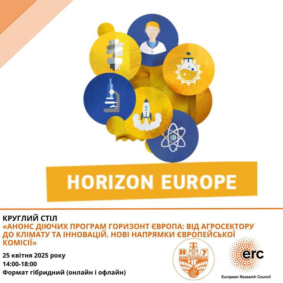Національний контактний пункт програми «Горизонт Європа» за напрямом «Європейська дослідницька рада» «Правові та фінансові аспекти» запрошує вас на круглий стіл «Анонс діючих програм Горизонт Європа: від агросектору до клімату та інновацій. Нові напрямки Європейської Комісії», який відбудеться 25 квітня 2025 року, 14:00-18:00 год. (за київським часом)