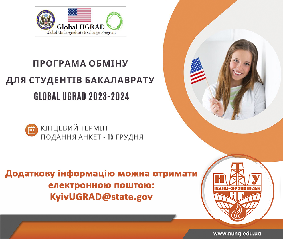 Державний департамент США оголошує відкритий конкурс для участі у 2023-2024 академічному році у програмі обміну для студентів бакалаврату вищих навчальних закладів (Global Undergraduate Exchange Program). Учасників програми відбиратимуть за такими критеріями: академічна успішність, лідерський потенціал, активність у громадському житті, володіння письмовою та розмовною англійською мовою, мотивація та готовність стати учасником програми обміну.