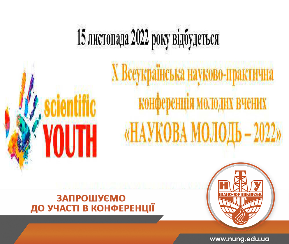 Рада молодих вчених ІФНТУНГ як співорганізатор запрошує до участі у Х Всеукраїнській науково-практичній конференції молодих вчених «НАУКОВА МОЛОДЬ – 2022», яка відбудеться 15 листопада 2022 року