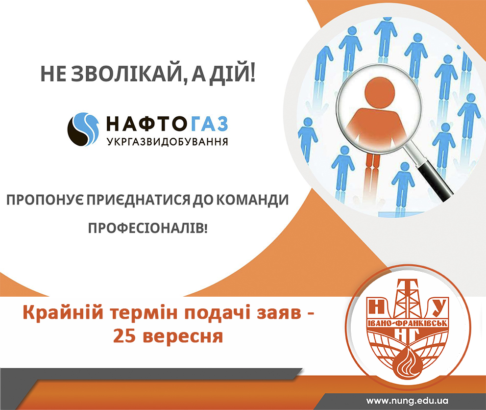 Партнер ІФНТУНГ - Укргазвидобування запрошує молодих спеціалістів з ґрунтовними теоретичними знаннями, але з невеликим (до 3 років) чи відсутнім взагалі досвідом роботи приєднатися до команди професіоналів. Не зволікай, а дій – маємо 12 вакансій!