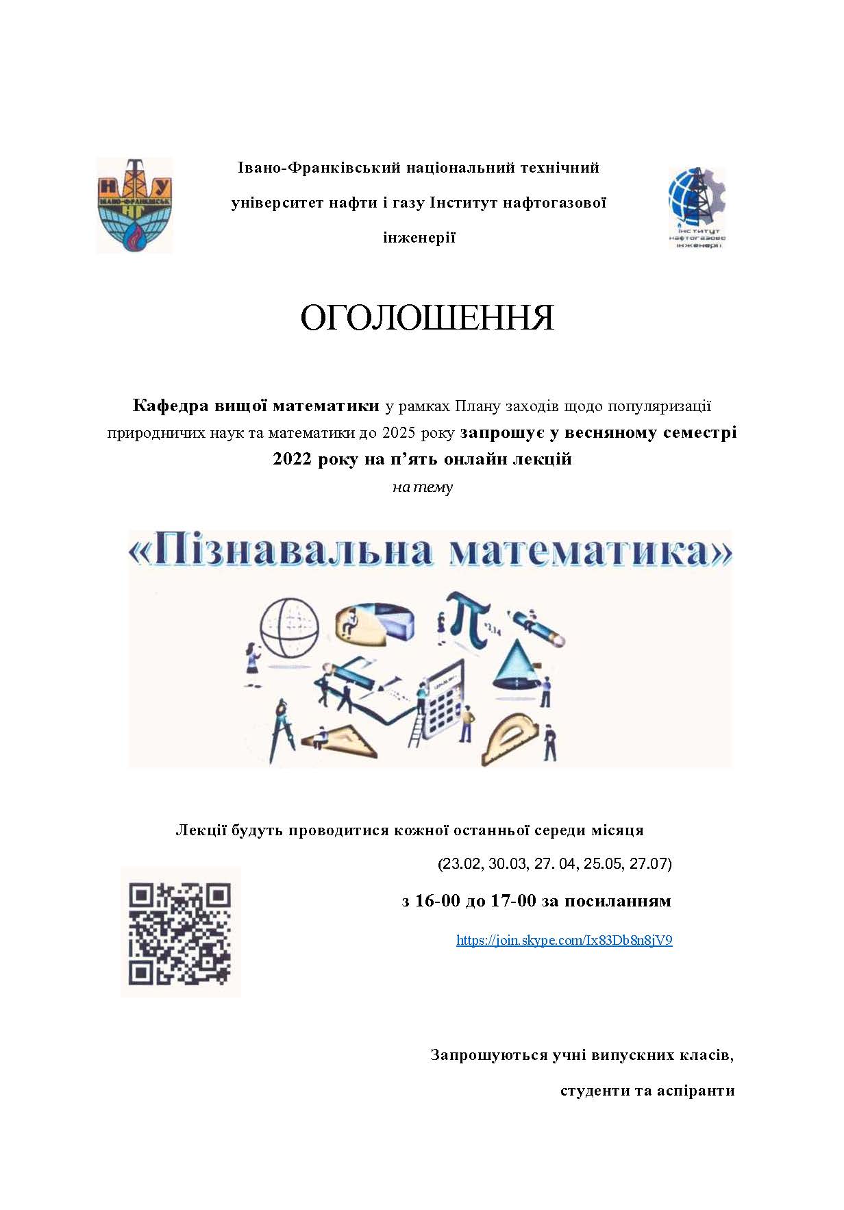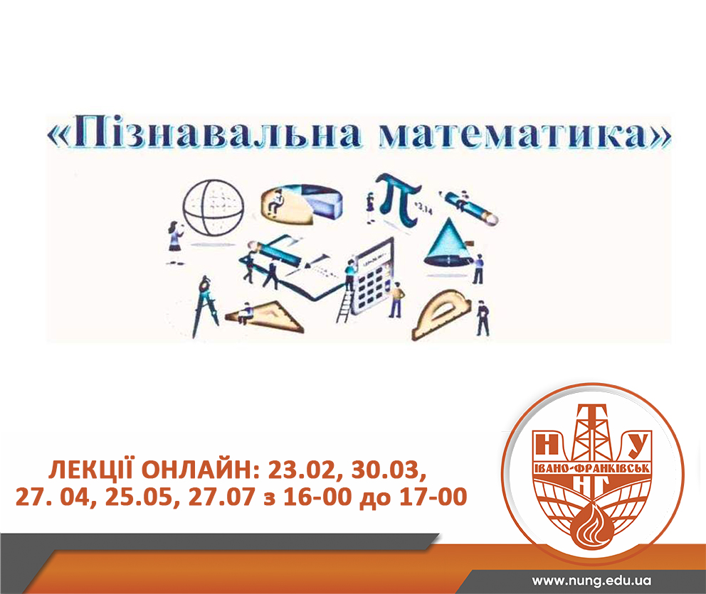 Кафедра вищої математики у рамках Плану заходів щодо популяризації природничих наук та математики до 2025 року запрошує у весняному семестрі 2022 року учнів випускних класів, студентів та аспірантів на п’ять онлайн лекцій на тему «Пізнавальна математика».