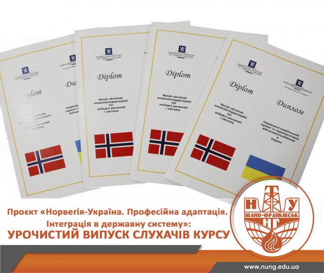 22 грудня о 16:00 у науковому містечку "Нова Енергія" (вул. Карпатська, 15) відбудеться урочисте вручення дипломів учасникам програми перепідготовки військовослужбовців, учасників АТО/ООС та членів їх сімей у рамках міжнародного проєкту «Норвегія-Україна. Професійна адаптація. Інтеграція в державну систему»*.