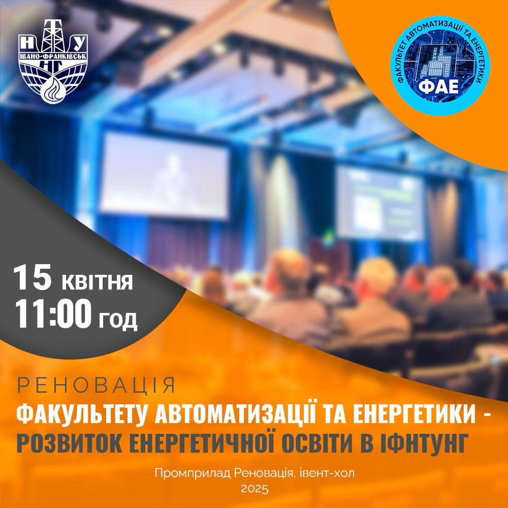 Маємо честь запросити Вас на презентацію реновації в ІФНТУНГ «Факультету автоматизації та енергетики» (ФАЕ) як відродженого бренду і водночас уже нового підрозділу в університеті, діяльність якого відкриває шлях до підготовки кадрів та наукової роботи за відповідними напрямками для відбудови, оновлення і зміцнення енергетичної сфери України.